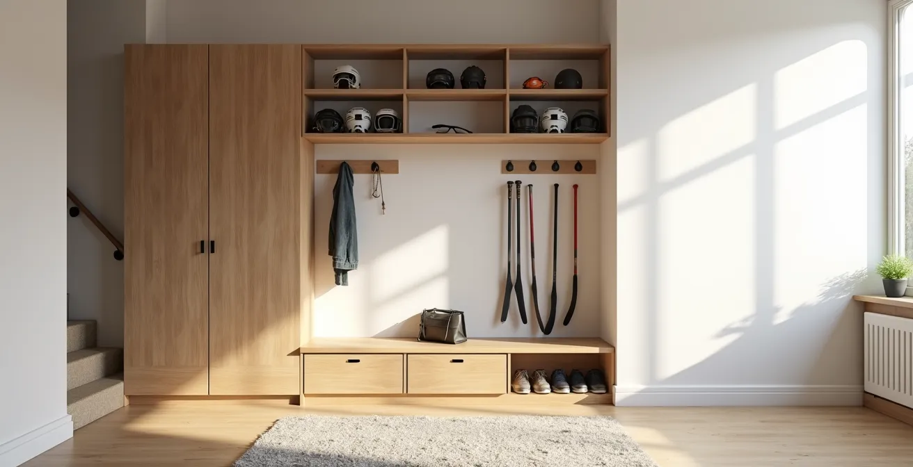 La clé pour maîtriser le chaos de l’équipement sportif n’est pas de le cacher, mais de l’intégrer avec des solutions de rangement performantes qui sculptent votre espace.
