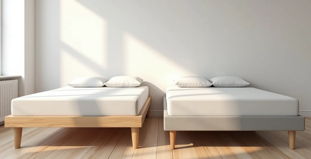 Le premier ennemi est l’humidité. Les normes de construction résidentielle canadiennes indiquent que l’humidité relative en sous-sol peut facilement dépasser 65 % sans une ventilation adéquate. Une telle atmosphère est non seulement inconfortable, mais elle favorise aussi le développement de moisissures, particulièrement dans le matelas. C’est ici que le choix du support de lit devient primordial. Un lit plateforme posé directement au sol ou un sommier tapissier rigide sans pieds sont à proscrire. Il est impératif d’opter pour un lit sur pattes (minimum 15 cm) avec un sommier à lattes pour garantir une circulation d’air constante sous le matelas et permettre à l’humidité de s’évacuer.